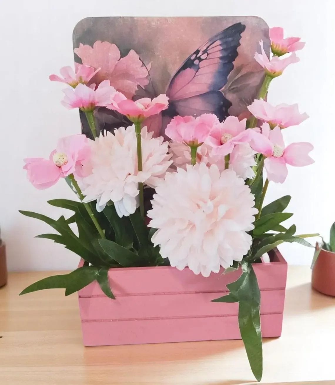 Rustic Artificial Flower Arrangement in Wooden Butterfly Decoupaged Planter Box